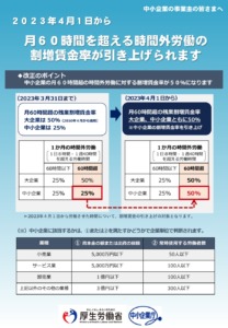 2010年4月から大企業を対象に、1か月の起算日からの時間外労働時間数の累計が60時間を超えた時点から50%を超える割増賃金率での支払いが義務付けられましたが、2023年4月から中小企業もその対象となります。