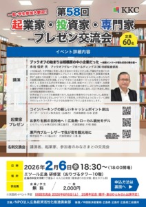 会長/山下江が理事長を務めるNPO法人広島経済活性化倶楽部(KKC)は、第58回 起業家・投資家・専門家プレゼン交流会を下記日程で開催いたします。