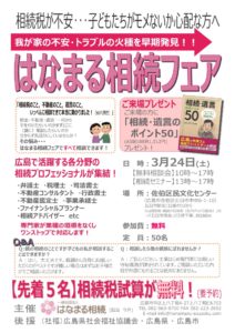 平成30年3月20日(火) 第一部 13:30~14:30 「生前に整理しておくべき不動産“あるある”話」 ■講師:相続アドバイザー/今井 絵美 弁護士/加藤 泰 ■会場:ホテルメルパルク広島 6階「安芸」 ■受講料:無料 【詳しく見る】 |