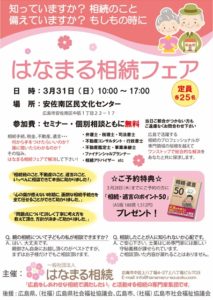 | 日時:平成31年3月31日(日)10時~17時 会場:安佐南区民文化センター 参加費:セミナー・個別相談ともに無料 定員:25名(セミナー・個別相談ともに予約優先) 特典:3/28までにご予約の方に相続本(全188頁・1,512円相当)をプレゼント 後援:広島県、(社福)広島県社会福祉協議会、広島市、(社福)広島市社会福祉協議会 【詳しく見る】 |