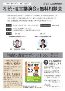 ~「相続・遺言のポイント55」出版記念~ 日時:2019年3月15日(金)14:00~15:30 |