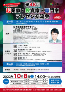 会長/山下江が理事長を務めるNPO法人広島経済活性化倶楽部(KKC)は、第48回 起業家・投資家・専門家「プレゼン交流会」を下記日程で開催いたします。