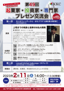 会長/山下江が理事長を務めるNPO法人広島経済活性化倶楽部(KKC)は、第49回 起業家・投資家・専門家「プレゼン交流会」を下記日程で開催いたします。