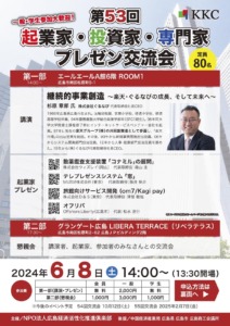 会長/山下江が理事長を務めるNPO法人広島経済活性化倶楽部(KKC)は、第53回 起業家・投資家・専門家プレゼン交流会を下記日程で開催いたします。
