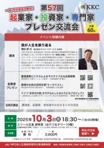 会長/山下江が理事長を務めるNPO法人広島経済活性化倶楽部(KKC)は、第57回 起業家・投資家・専門家プレゼン交流会を下記日程で開催いたします。